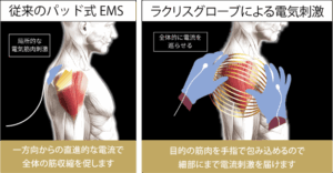 直線的な電流で筋収縮を促すのではなく、グローブで微弱電流を操ることで